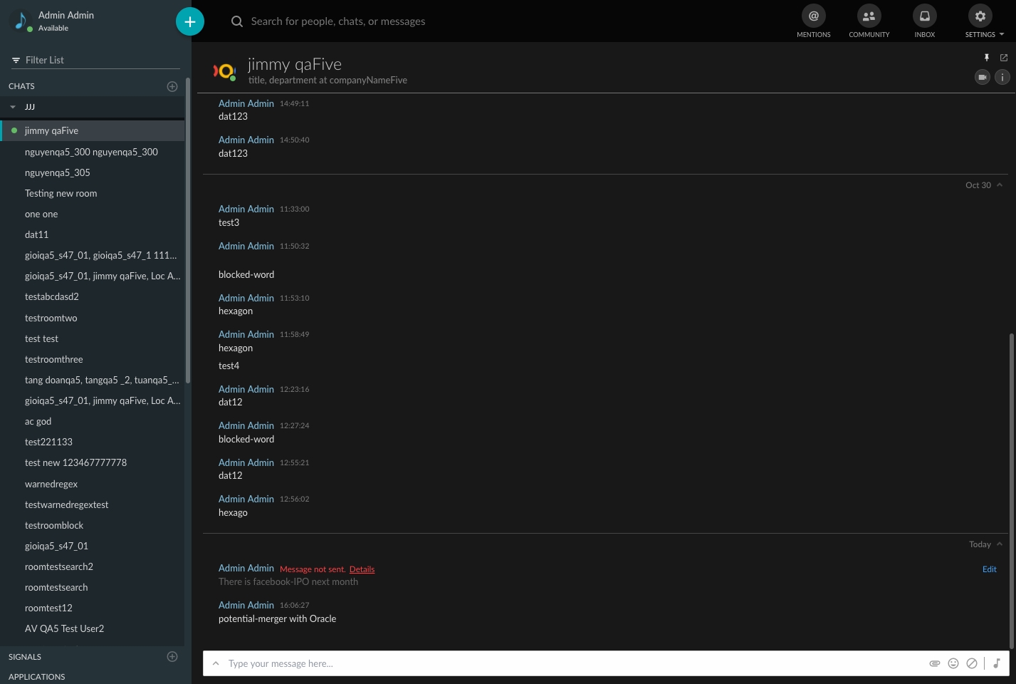 Message Violations: A Block or warning that happens when sending messages with terms that match the violation policy. EFv2 provides DLP enforcement on the content (except mentions) of IMs, MIMs, chat rooms, wall posts, shared signals, posts on behalf of, shared wall posts, shared articles, blasts, forwards and replies.